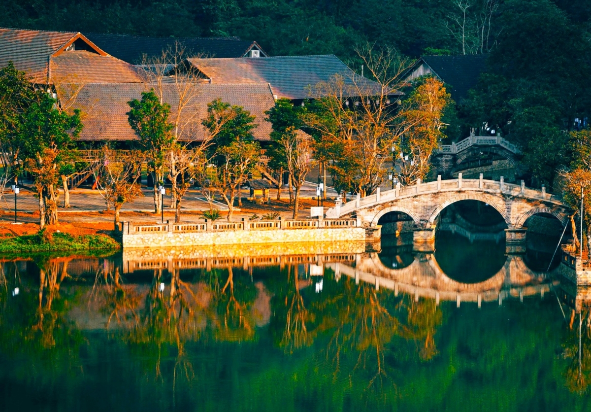 Cầu đá uốn cong: Những nhịp cầu đá được đẽo gọt hoàn toàn thủ công, nhẹ nhàng bắc qua dòng nước, tạo nên hình dáng mềm mại như dấu vết lắng đọng của thời gian.