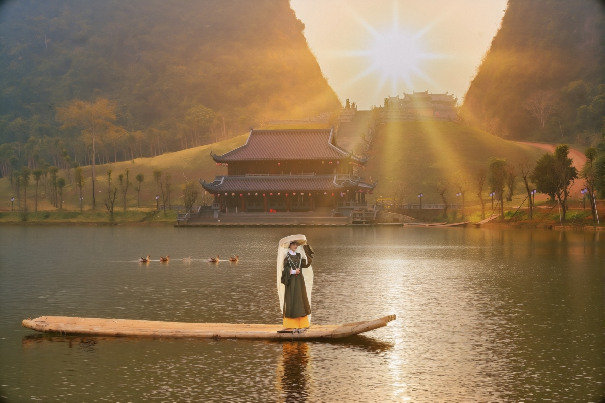 Nhà cổ rêu phong: Các nếp nhà gỗ mái ngói mũi hài soi bóng xuống mặt hồ phẳng lặng, gợi lại hình ảnh Hành cung Hoa Lư xưa – uy nghiêm mà trầm mặc.